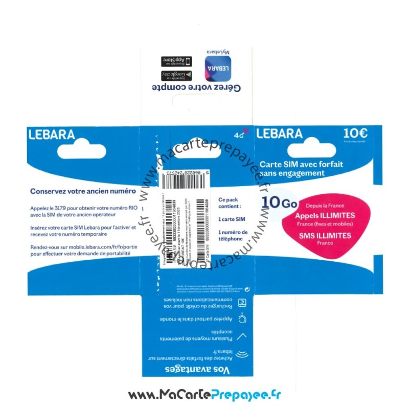 Qu’est-ce que la SIM Lebara ? La carte SIM prépayée Lebara Mobile vous offre une possibilité économique et flexible d’appeler à l’étranger sans souci directement depuis votre téléphone portable avec la meilleure qualité de réseau D. Commandez dès maintenant votre pack de démarrage de carte SIM avec 10€ de crédit (7,50€ de crédit de démarrage + 2,50€ de crédit pour la 1ère recharge).