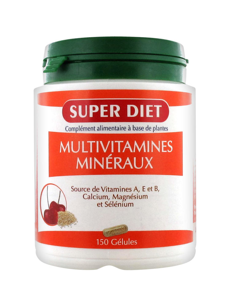 Les vitamines et les minéraux sont indispensables à la vie (Super Diet Multivitamines Mineraux 150 Gelules). Vitamines multivitamine sap. Étant donné que l’organisme humain ne peut pas produire lui-même de micronutriments – à l’exception de la vitamine D -, ceux-ci doivent être apportés quotidiennement par l’alimentation. Comparé aux glucides, aux protéines et aux graisses, le corps n’en a toutefois besoin que de quantités infimes.
