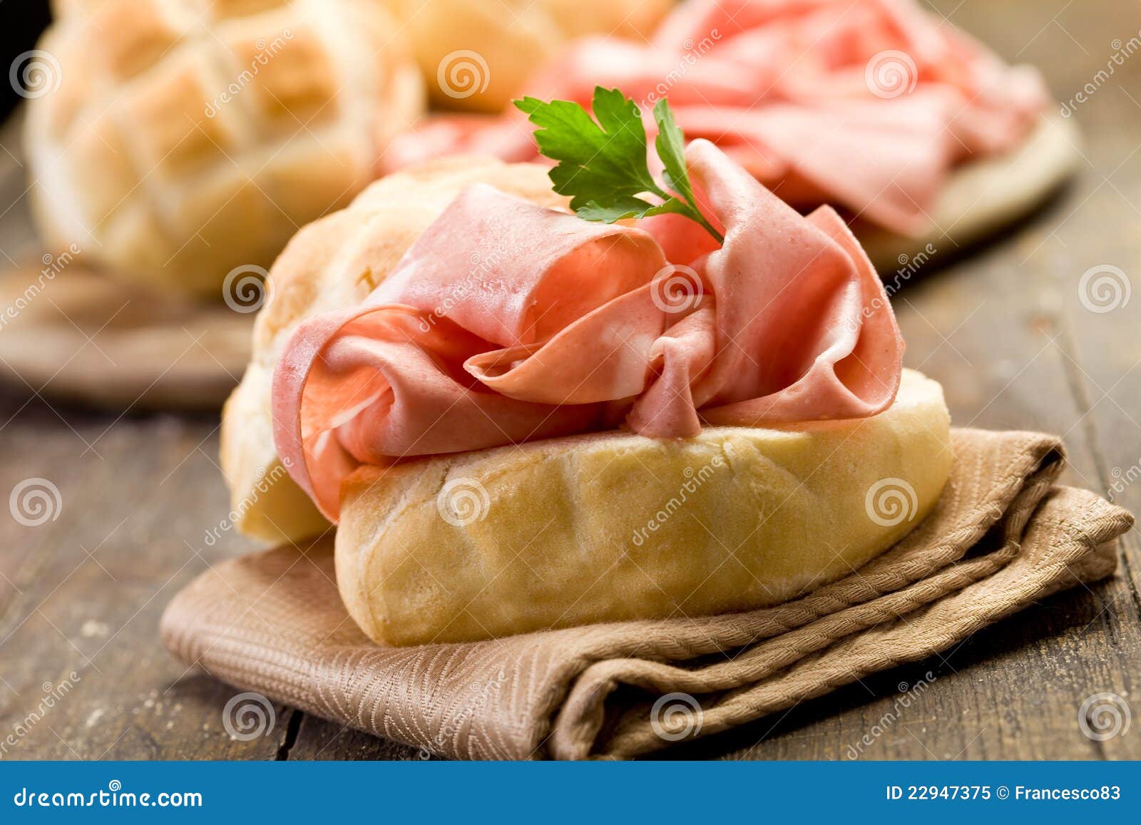 Le goût est équilibré et savoureux (Sandwich Avec La Saucisse De Mortadelle Image stock). Saucisse mortadelle. Il possède en outre un arôme typique. La mortadelle est généralement coupée très finement et consommée froide sur du pain.