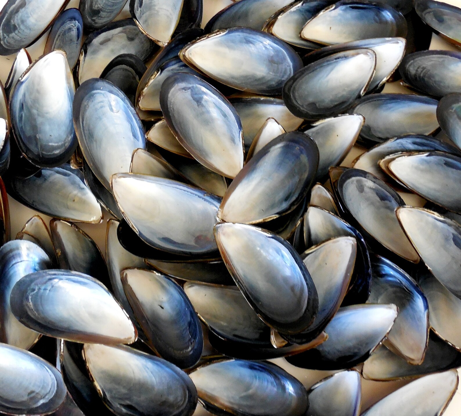 Les coquilles de moules sont principalement composées de carbonate de calcium (calcaire), qui se présente sous la forme d’un minéral, l’aragonite. Les cristaux d’aragonite sont mastiqués par une substance organique, la conchyne. Les coquilles sont formées par le manteau, un pli de la peau du mollusque.