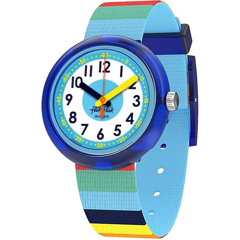 Quel pointeur est Flik ? Flik, le frère de Flak, fait le tour du cadran avec l’aiguille bleue une fois par heure en pointant les chiffres bleus des minutes, tandis que Flak, dans sa robe rouge, se promène d’un chiffre rouge des heures à l’autre. Les montres Flik Flak ont été spécialement conçues pour aider les enfants à lire l’heure.