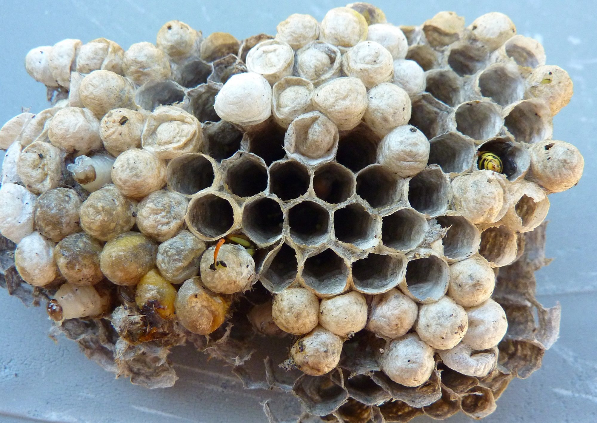 Contrairement aux nids de frelons ou de guêpes, l’intérieur d’un nid d’abeilles est clairement reconnaissable : il se compose de plaques verticales en cire alvéolées, elles-mêmes divisées en cellules hexagonales (guepes sortir antenne guepe depasse cocon voit veux). Guepes vs abeilles. C’est là que le pollen et le miel sont stockés et que la progéniture est élevée.