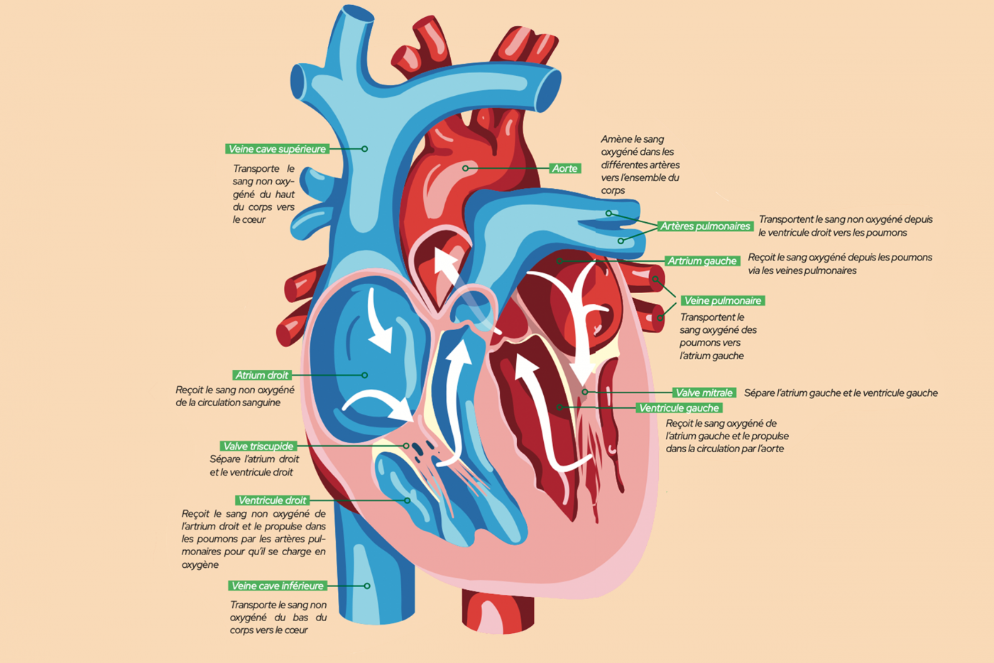 2 Physiologie Le sang désoxygéné est évacué du ventricule droit par le tronc pulmonaire et les artères pulmonaires vers les vaisseaux capillaires des poumons (Les troubles veineux). Sang oxygene coeur. Là, les échanges gazeux ont lieu dans les alvéoles pulmonaires : le sang libère du dioxyde de carbone (CO2) et absorbe de l’oxygène (O2).